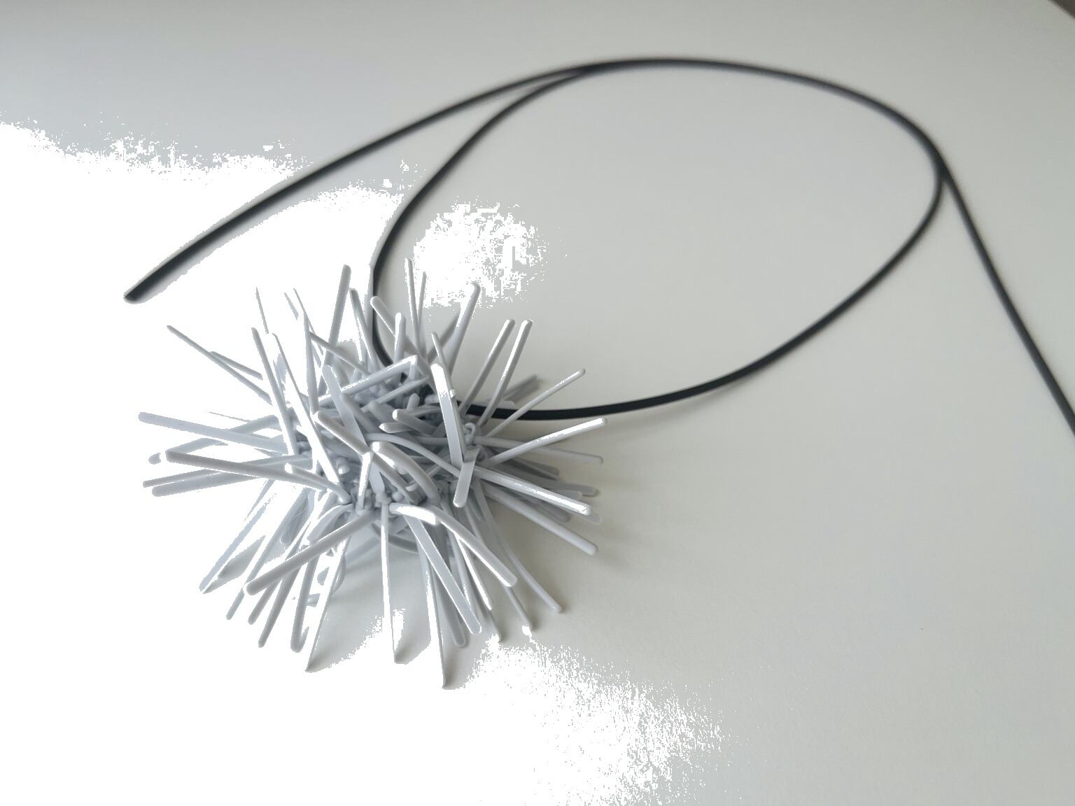 紐状のマグネットコードに、紐状シリコンを球体状に仕上げたヘッドを通したデザインのネックレスです。