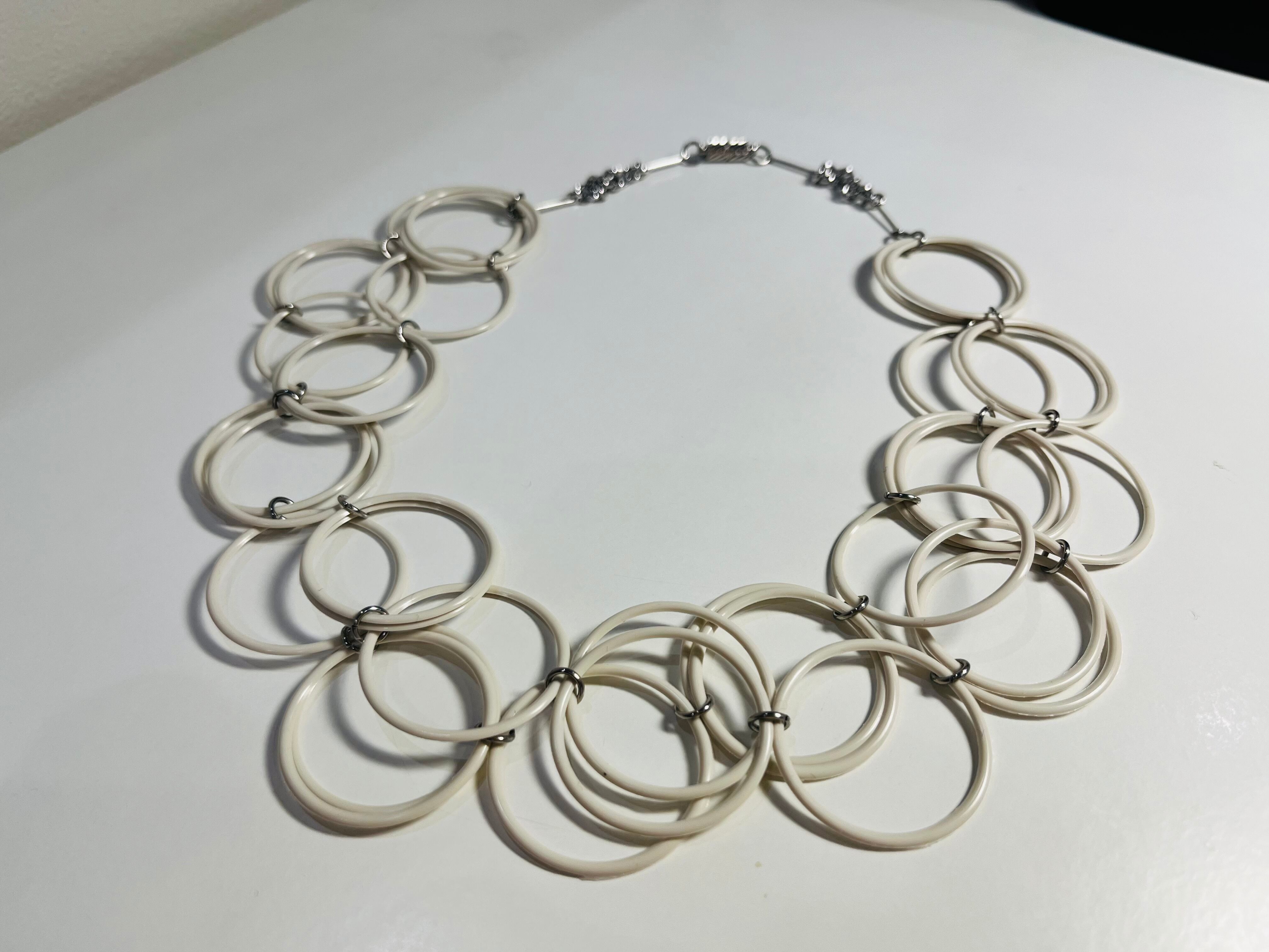 ネックレスLとは輪っかの組み方や数の違いがあり、Sはメタルチェーン部分も短くなって全体の長さはLより4cm短くなっています。ら